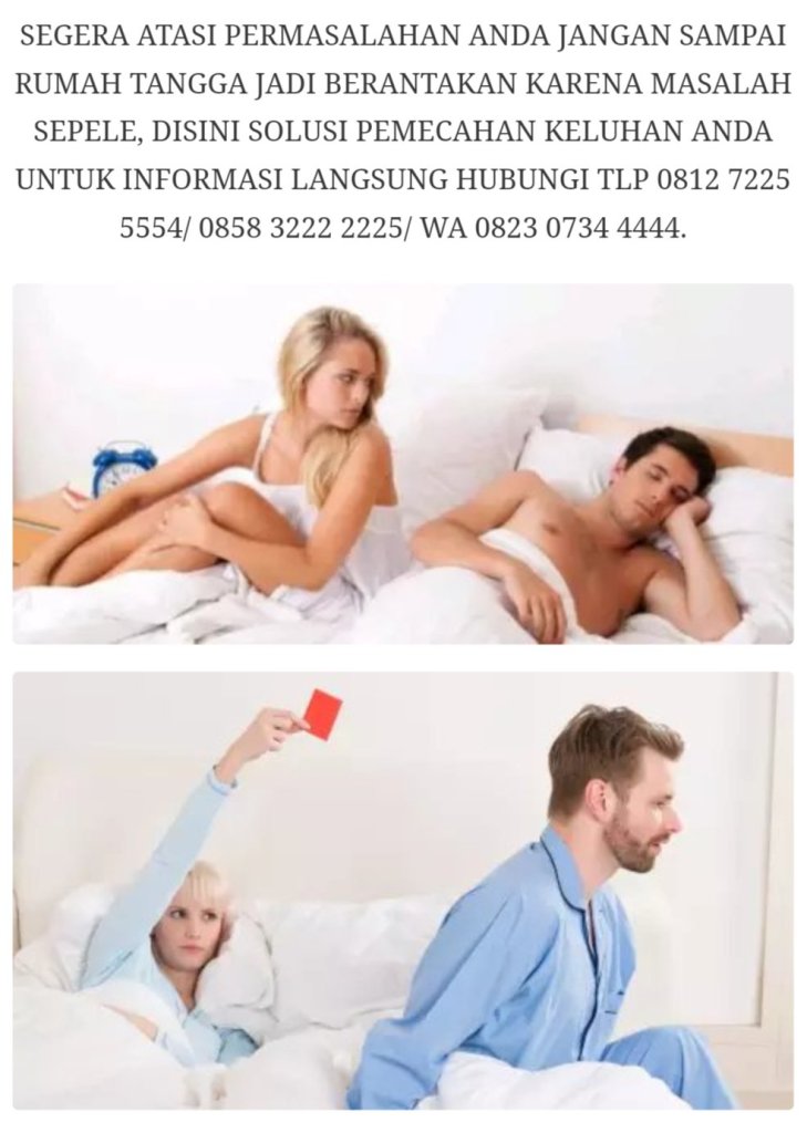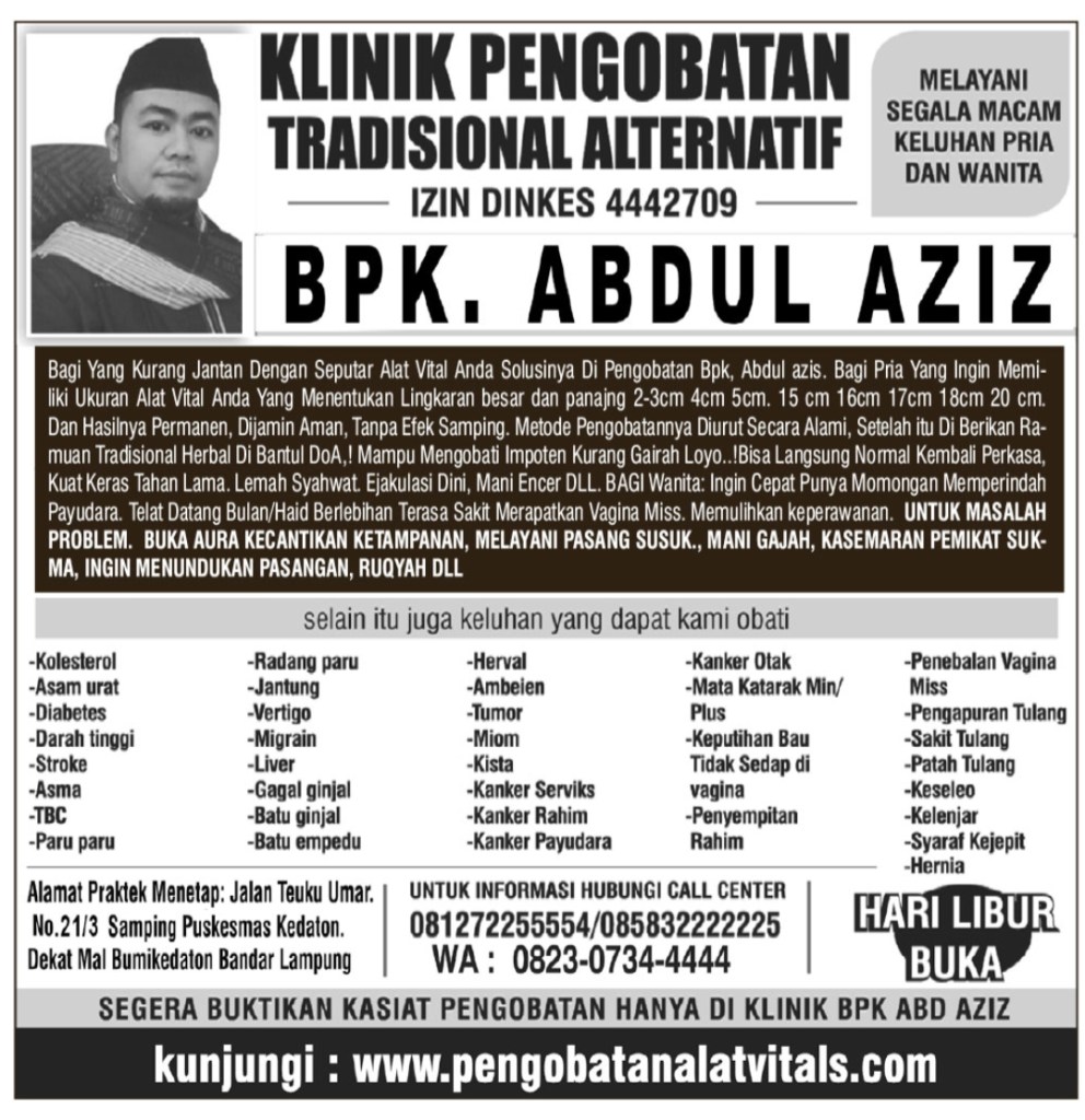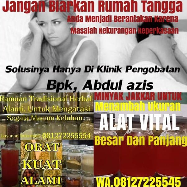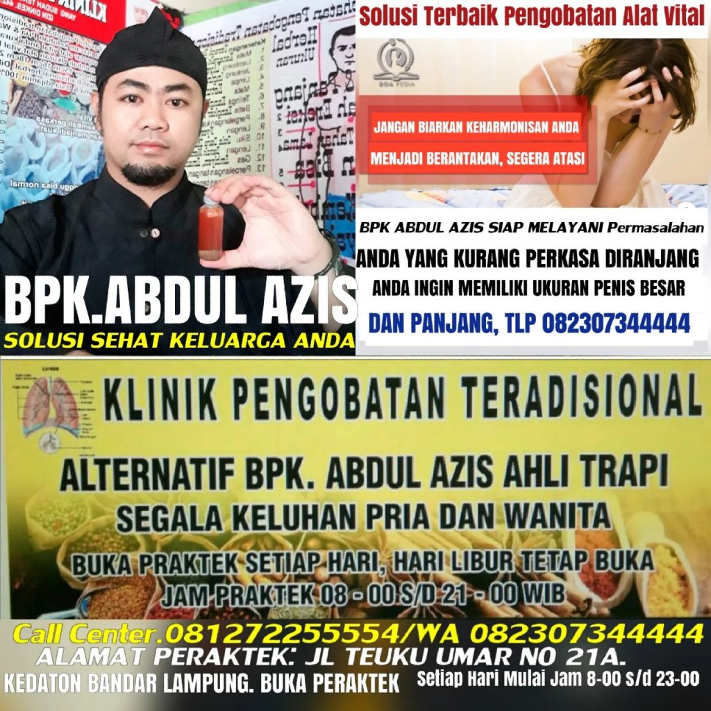 Urusan ranjang bisa jadi sumber masalah ke-tidakharmonisan dalam rumah tangga. Jangan biarkan hal itu terjadi pada anda. Kini telah hadir trapi alternatif pengobatan alat vital pria dan wanita, BPK Abdul azis, Dikedaton Lampung adalah salah satu pendekar kejantanan pria paling berpengaruh yang telah malang-melintang ke berbagai daerah dalam rangka memberikan solusi bagi para pria maupun wanita.