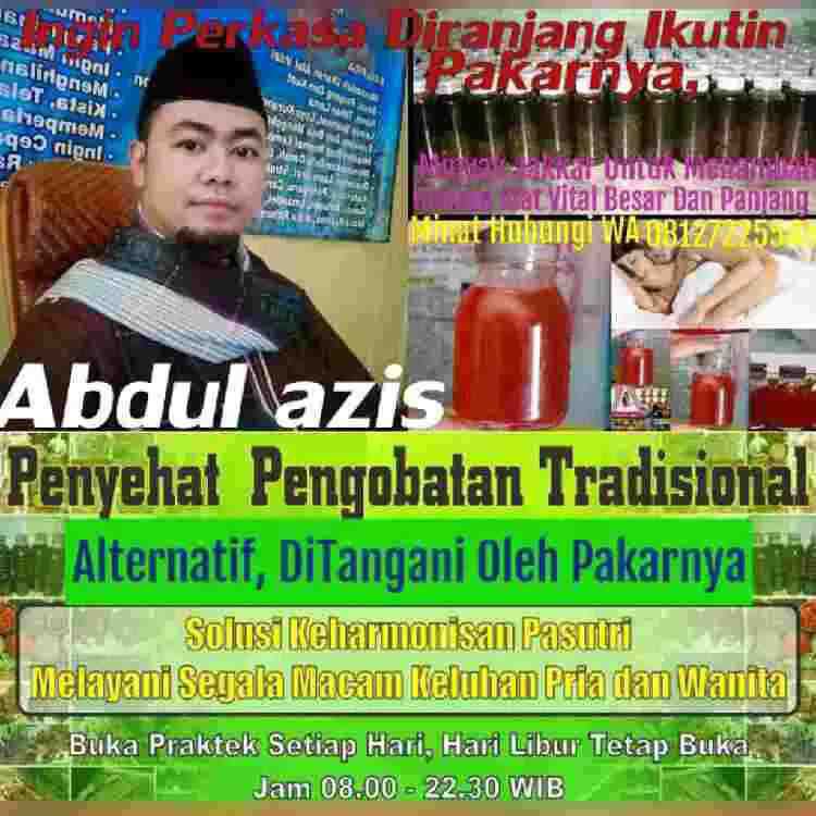 solusi bagi pasangan baru menikah hingga yang sudah berusia lanjut. Abdul azis membuka praktik di beberapa kota di Jawa, Sumatera, Kalimantan, Sulawesi, Jambi, Palembang, Medan, Padang, Dumai, Pekanbaru, Batam, Serang, Banten dan sekitarnya. Klinik Terapi Kejantanan Pria Bpk Abdul azis, Prosesnya cepat, menyelesaikan masalah tanpa masalah. Karena metode terapinya aman, dan ramuan herbal yang diberikan juga tidak ada efek samping. Melayani Menambah Ukuran (Panjang, Besar, Keras Kuat Tahan Lama Diranjang.